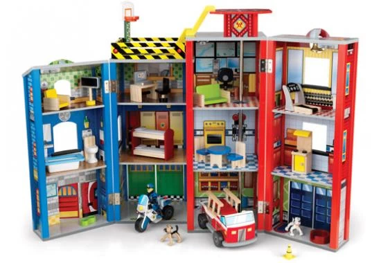 Alarm!, Alarm! Er is brand uitgebroken in de stad. Glijd langs de brandweerpaal en spring snel in de auto! Met deze speelset kunnen kinderen zich echte helden wanen die dringende oproepen beantwoorden en iedereen veilig houden. Compleet met garage / stalling voor brandweerauto en politiemotor. Op het dak is er landingsplaats voor de helikopter.