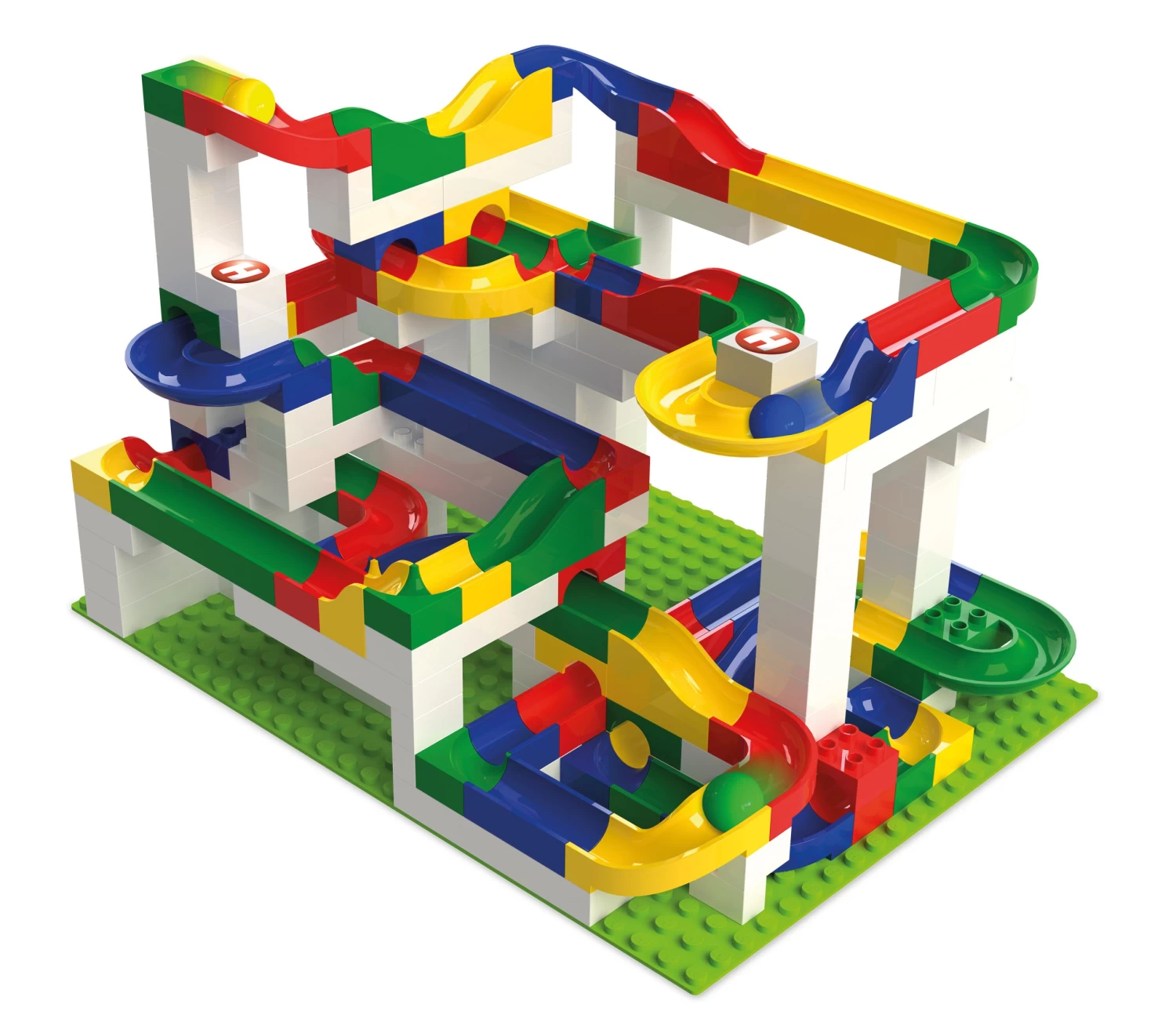 Deze grote Hubelino-bouwdoos is de perfecte start voor de beginnende knikkerbaanbouwer. Er zitten veel baanelementen en bouwstenen in meerdere vormen en kleuren en van verschillende grootten. Daarmee kan van alles worden gebouwd, van simpele tot complexe bouwwerken, met oneindig veel mogelijkheden en onnoemelijk veel bouwplezier. Alles wat de kleine bouwmeester voor zijn eerste eigen knikkerbaan nodig heeft wordt door Hubelino in een praktische koffer geleverd: bouwstenen, knikkerbaanelementen, knikkers/kogels, grondplaten en een uitgebreid geïllustreerde gebruiksaanwijzing.