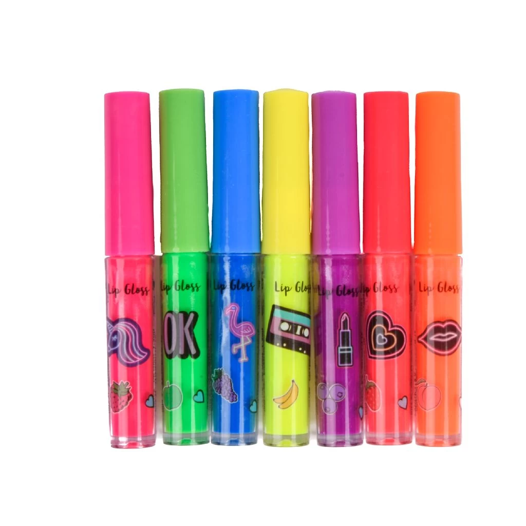 Deze set bestaat uit zeven verschillende lipglossjes die elk een verschillende kleur hebben: fel geel, roze, blauw, groen, rood, paars en oranje!