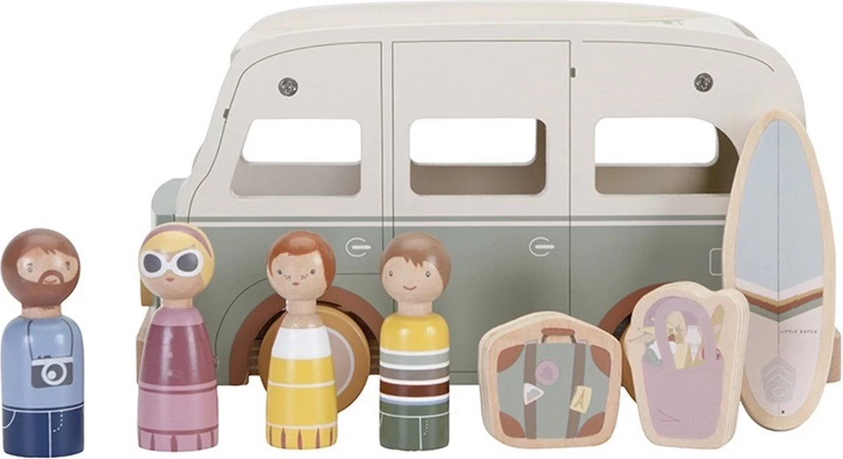 Laten we op een avontuur gaan! Stap in de camper en maak je klaar voor een dagje strand of een uitstapje met de familie. Vergeet je koffer, strandtas en surfplank niet mee te nemen! Het dakje van deze houten vintage camper kun je er af halen zodat de 4 houten poppetjes er makkelijk in passen. De achterklep kan open om de bagage achterin de camper op te bergen.