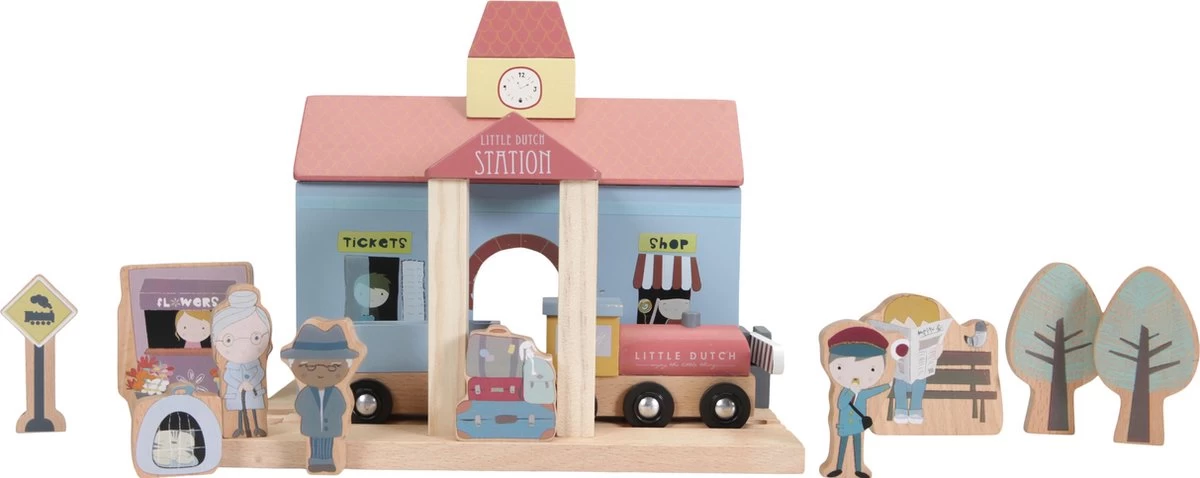 Laten we op een avontuurlijke trip gaan! Pak je spullen, neem je huisdier mee en spring op de volgende trein. De uitbreiding bevat een kiosk, conducteur, reizigers, bomen, koffers, kattenmandje, stationsklok, trein, locomotief en treinstation. Dit houten treinstation is één van de vele speelsets die aan de treinbaan XXL van Little Dutch gekoppeld kan worden. De houten figuren hebben gedetailleerde illustraties aan beide kanten en kunnen in de treinwagon geplaatst worden voor een leuke rit. Je maakt het treinstation helemaal af met de treinbaan XXL en de uitbreidingssets voor uren speelplezier. x