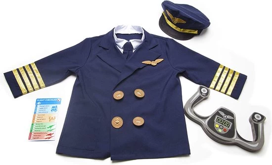 Kan een kostuum met je verbeelding op de vlucht gaan? Zeker weten. Deze realistische speelset voor piloten bevat een stuurknuppel die net echt lijkt, en een uniform dat kinderen gemakkelijk zelf aan en uit kunnen trekken. Aan het jasje is een overhemd bevestigd met een verwijderbare stropdas, zodat onze piloten in een handomdraai klaar zijn om te vertrekken! De pret wordt nog groter met een herbruikbare activiteitenkaart die is voorzien van een checklist voor het vliegen en een realistische routekaart, zodat de jonge piloten een bestemming kunnen kiezen, hun cockpit kunnen inrichten en kunnen opstijgen op weg naar eindeloze avonturen! De verkleedset bevat een uniformjasje met de voorzijde van een overhemd, een pilotenpet, een verwijderbare stropdas, een speldje, een herbruikbare checklist en een stuurknuppel.