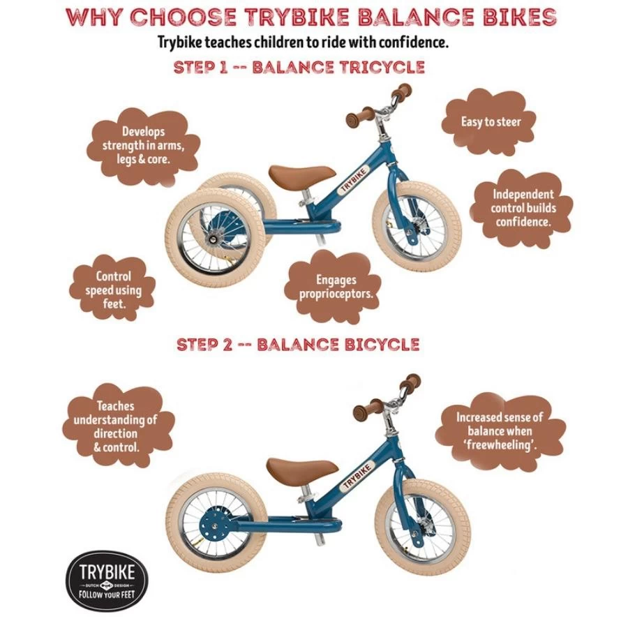 Loopfiets in vintage kleurstelling voor kinderen van 1,5 – 6 jaar. De eerste stand van de Trybike is de lage driewieler met veel stabiliteit om makkelijk loop- en rijvaardigheden te ontwikkelen. Hiermee leren kinderen al vanaf 15 maanden lopen én fietsen.
