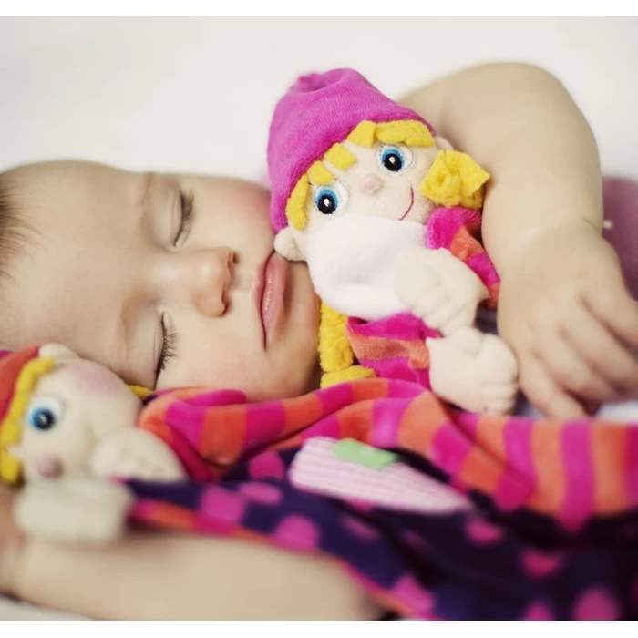 Wat een schattige tuttelpop is Dottie. Dottie behoort tot de collectie van de Goodies poppen van Rubens Barn. Ze heeft aan de voor- en achterkant verschillende motieven en heeft grappige blonde vlechten. Het duimpje zit vast in de mond. De pop is met de hand uitwasbaar en al geschikt voor de allerkleinsten!